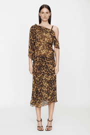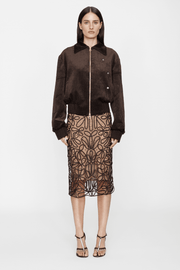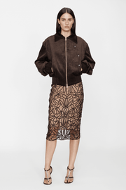 “The starting point is always tactile, which is very apparent for FW25. The collection brought together three areas of inspiration – flamenco, decadent upholsteries, and shibari knots. I’m interested in bringing unexpected combinations together to create something new. So, in this collection, you’ll see the fluidity and movement of flamenco dance, deeply tactile textiles like velvet and brocade reminiscent of lived-in upholsteries, and intricate shibari knots that double as straps and concealed bodices beneath sheer silhouettes. Being an international Fall Winter collection, jewel tones set the tone for the season, with an injection of mustard and a bespoke tortoiseshell print bringing light relief to an otherwise sensual palette.”
