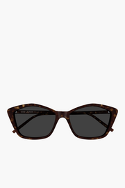 The Angular Cat Eye Sunglasses in Havana by Saint Laurent are crafted in extra-fine acetate. Featuring soft cat eye lines and a feminine silhouette, they are finished with the house logo in enameled letters. This style delivers refinement and ease in equal measure.