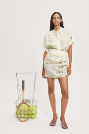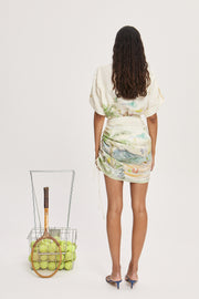 The Anouk Skirt from Alémais showcases exclusive artwork in collaboration with Anouk Colantoni. A contemporary take on a classic mini, designed with a relaxed silhouette, this piece features adjustable drawstring ruching at the side seam for a customizable fit.