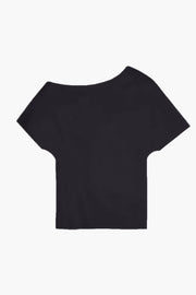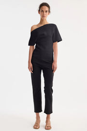 The Asymmetrical Punto Milano Knitted Top in Black from RÓHE is crafted from structured viscose-blend jersey with a soft yet sculptural hand. Featuring a slashed neckline and soft bell sleeve, this design balances bold asymmetry with elegant drape. A modern essential for elevated day-to-evening styling.