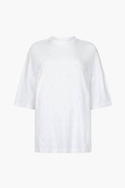 The Beaded Gibson Tee in Pearl from Harris Tapper is a signature design that exudes understated elegance. Featuring hand-sewn pearls, this piece is crafted with meticulous attention to detail. The drop shoulders and elbow-grazing sleeves are purposefully designed for an oversized fit, creating a relaxed yet refined silhouette. Perfect for elevating everyday ensembles or making a subtle statement at special events.