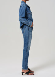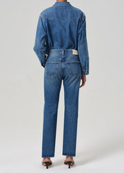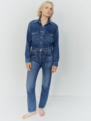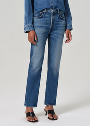 The Blaine Jean in Chaya by Citizens of Humanity is a timeless staple, designed with a versatile 29-inch inseam and a straight cut from the knee to the leg opening. Featuring a medium to light indigo wash with authentic whiskering and fading, this jean offers a vintage-inspired look. Crafted from rigid, non-stretch regenerative cotton, it provides a structured yet soft hand feel for everyday comfort.