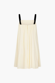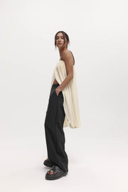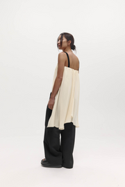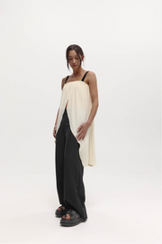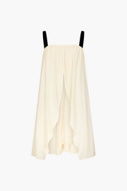 The Bogart Top in Vanilla from Harris Tapper is a statement piece designed in vanilla tech taffeta with a voluminous, flowy silhouette. Inspired by '50s nightwear, gathers cascade from the bust, creating soft movement and feminine ease. Wide velvet straps secure an internal bra with hook-and-eye closures at the back, while the front slit and mid-thigh length add an alluring finish. Pair with slim tailored pants or sleek leather for an elevated evening look.