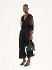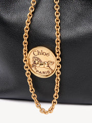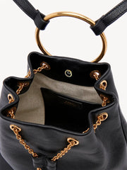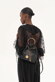 The Bracelet Backpack in black by Chloé is a refined yet versatile design, crafted from grained buffalo leather for a supple, structured silhouette. Featuring the Maison's signature oversized bracelet handle, drawstring chain closure, and Horse Medal emblem, this backpack is designed to transition seamlessly from hand-carry to shoulder wear with its removable and adjustable straps. Wear with tailored separates or relaxed weekend looks for an elevated everyday accessory.