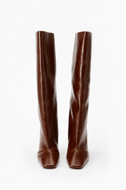 The Bridge Knee High Boots in Brown from Coperni reinterpret classic silhouettes with a bridge-inspired arched sole, a block heel, and a square-shaped toe. Designed with a subtle triangular structure, they create a sleek and flattering effect on the leg. Style for day to night.