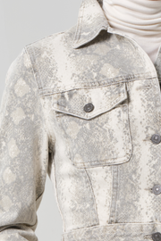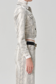 The Charisse Shrunken Jacket in Python by Citizens of Humanity offers a modern update to a classic denim silhouette. Crafted from comfort-stretch denim with a super-soft hand feel, it features a subtle white and grey python print for a refined statement edge. Designed with a cropped, tailored fit, front pockets, and seam detailing, it layers effortlessly over tees or lightweight knits for an elevated everyday look.