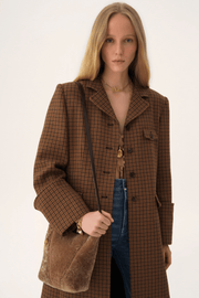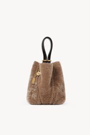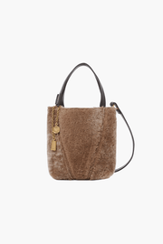 The Chloé Mini Spin Tote in Floral Grey by Chloé is a luxurious, textural accessory crafted from soft lamb shearling panels contrasted with smooth calf leather. Its signature gold-tone ring detail allows the silhouette to shift into a slouchy bucket shape, while the dangling logo chain hardware adds a refined Chloé touch. Designed with practicality in mind, this compact yet functional tote holds daily essentials with ease and offers versatile carry options thanks to its top handles and detachable adjustable strap.