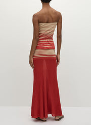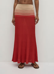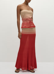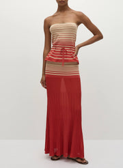 The Citara Skirt in Accordion Stripe Amber Fawn from Faithfull The Brand is a pleated maxi designed to move with effortless fluidity. Crafted in a sheer knit with a tonal stripe pattern, it features fine accordion pleats that create soft texture and volume. Pair it with the coordinating bandeau top for a matching set, or style it with crisp shirting for contrast.