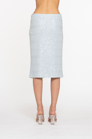 The Classic Longuette in Blueberry by Des Phemmes is a statement midi skirt that balances refined structure with playful embellishment. Set against a softly shimmering pale blue base, this style is detailed with intricate three-dimensional sequin appliqué in contrasting yellow and black, creating a delicate, botanical-inspired effect. Designed to sit at the waist, the silhouette falls to a flattering midi length.