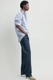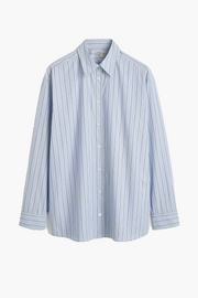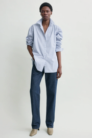 The Classic Stripe Shirt in Ice/Azure from TOTEME is a crisp wardrobe essential reimagined with structured refinement. Crafted in pure cotton with fine blue-toned stripes, it channels a preppy sensibility through subtle tailoring. A back T-stitch detail adds minimalist structure, while the shirt’s crisp finish is perfect for styling with the collar popped and sleeves nonchalantly rolled.