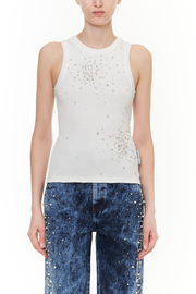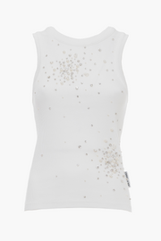 The Classic Tank Top in Off White by Des Phemmes is a modern update on a classic silhouette. Crafted from a fine ribbed cotton blend, the Tank Top is adorned with crystal embellishments for a playful yet refined edge. Featuring a rounded neckline and sleeveless cut, it can be styled effortlessly with denim for daytime or paired with statement trousers for evening wear.