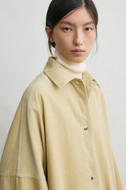 The Cord Overshirt Jacket in Beige from TOTEME channels utilitarian ease with a subtle nod to Americana. Cut from soft washed organic cotton corduroy, this transitional outerwear piece is designed with a roomy, oversized fit, complete with dropped shoulders and wide sleeves for a relaxed, contemporary look. Silver-tone snap buttons and large patch pockets add structure and finish. Style it open over tonal separates for effortless layering.