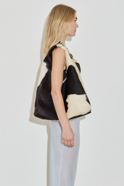 The Cowhide Bag in Black/White Hide from Maison Essentiele is a bold statement accessory, designed to bring texture and playfulness to everyday dressing. Crafted from genuine haircalf leather, its exaggerated hobo shape curves softly over the shoulder while maintaining a lightweight structure. The oversized scale and black-and-white cowhide pattern give it a directional edge, perfect for punctuating minimalist outfits.