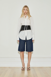 • Oversized brushed chrome buckle in elongated oval shape