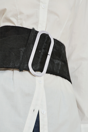 The Cowhide Wide Belt in Black by Maison Essentiele is a versatile accessory designed for adaptable styling. Crafted from 100% leather, it features an oversized brushed chrome buckle in an elongated oval shape, adding a bold statement to both casual and elevated looks. Pair it with tailored trousers, over a blazer, or cinched at the waist of your favourite dress for a refined finish.