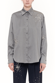 The Crookd Classic Shirt in Off White by Des Phemmes redefines classic tailoring with a touch of glamour. Crafted from crisp cotton blend fabric, this shirt is detailed with intricate crystal and bead embellishments that cascade across the shoulders and sleeves. Its relaxed fit and sharp collar balance contemporary femininity with structured elegance, making it the perfect statement piece for both day and evening styling.