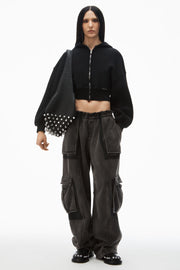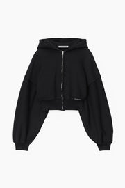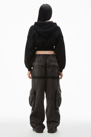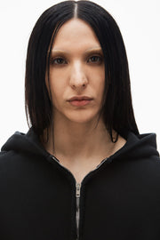 The Cropped Zip Up Hoodie With Branded Seam Label in Faded Black from alexanderwang.t is a relaxed fitting jacket with a zip closure and a cropped length. This style has an elasticated mid section and branded logo detailing. Pair yours with your favourite activewear for a chic and casual look.