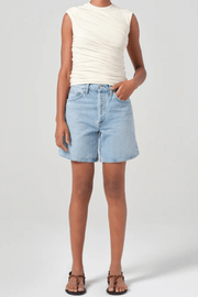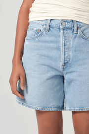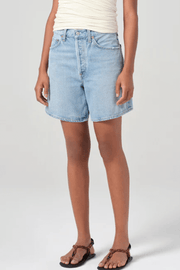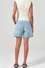 The Dame Short in Coax by Agolde offers the perfect combination of laid-back style and elevated design. Crafted from regenerative cotton, these shorts have a distinct, worn-in look. The high-rise fit and relaxed silhouette are complemented by a wide leg opening. Perfect for pairing with a simple tank or oversized shirt for an elevated summer look.