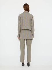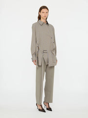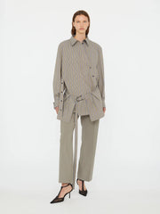 The Deconstruct Cotton Shirt in Eucalypt/Navy from Christopher Esber redefines classic shirting by merging structured tailoring with contemporary design. Crafted from compact mint stripe shirting, this waistcoat-inspired piece features grafted inner tailoring details at the back, creating a striking contrast between masculine structure and feminine fluidity. A waistcoat-style buckle cinches the waist, while an asymmetric placket and back cut-outs add a modern, deconstructed edge. Pair it with wide-leg trousers and a pump for a chic look.