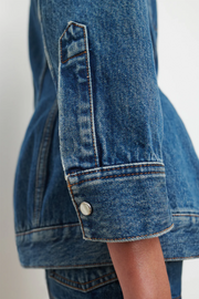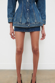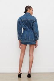 The Denim Contour Jacket in Indigo from WARDROBE.NYC is a sculptural reimagining of the classic denim jacket. Crafted from pure cotton, it is tailored with strong shoulders, a contoured waist and precise style lines that create a defined hourglass silhouette. Featuring patch pockets, a front and back yoke, snap closures and long sleeves with placket detailing, it’s a versatile piece to layer over separates or pair with denim for a coordinated set.