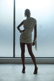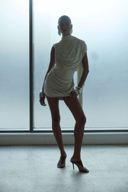 The Elara Mini Dress in Optic Cream from De La Vali is a fluid and sculptural silhouette designed to embrace the body with elegance and ease. Cut from soft viscose jersey, its draped construction creates an instinctive flow, tracing the figure through gathered pleats that fall across the waist and hip. A high neckline with scarf-wrap detail frames the face, while pleated shoulders lend subtle structure. Refined yet sensual, Elara transitions effortlessly from dusk to after-dark.