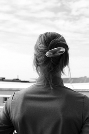 The Ellipse Hairclip in Silver from Annika Inez is crafted through a meticulous hand-shaping process known as "dapping," where the silver is gently formed using a hardened steel tool. The resulting subtle surface markings give this minimalist piece an artisanal, organic quality. Lightweight yet secure, it fastens with a classic French barrette. Wear it to elevate a sleek bun or low ponytail.