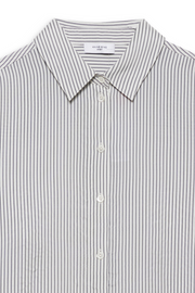 The Essie Shirt in White and Navy Stripe by Anine Bing is a classic tailored style crafted from lightweight 100% cotton poplin. Designed with an oversized boyfriend fit, it features dropped shoulders, a shirttail hem, and tonal branded buttons. A framed embroidered monogram is subtly hidden within the front placket for a refined finish. Wear it with relaxed denim and loafers for an effortless off-duty look.