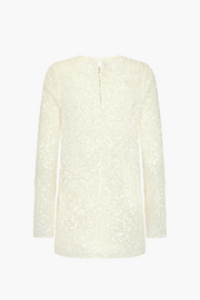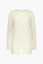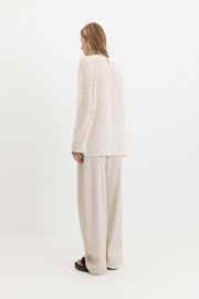 The Eva Top in Cream by Harris Tapper features a relaxed silhouette crafted from a sheer sequin knit. Designed with long sleeves and a button closure at the centre back, this lightweight piece offers subtle shimmer and an effortless drape for elevated ease. Wear it with tailored trousers and heels for a refined evening look.