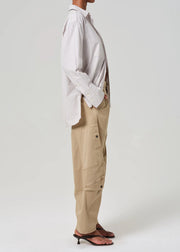 The Flight Pant in Catalina by Citizens of Humanity blends vintage-inspired utility with modern ease. Designed with a pleated waist and barrel leg silhouette, these cargo pants offer a structured yet relaxed fit. Crafted from midweight, breathable stretch twill, they feature pleat detailing, side pockets, and a soft hand feel that gives them a timeless, worn-in appeal.