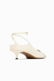 The Fornax Pump in Cream by Neous is a pointed heel in Nappa leather. This style has been expertly handcrafted in Italy and boasts a 40mm kitten heel. With gold hardware & two interconnected straps that wrap around the ankle, this style exudes elegance and style. Wear this style with anything from pants to dresses and pair with your favourite gold jewellery.