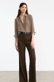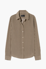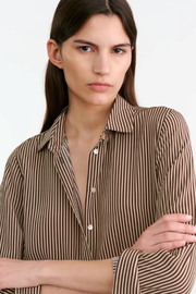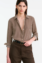 The Gaia Silk Shirt in Chocolate Stripes from Nili Lotan is a timeless wardrobe staple crafted from lightweight woven fabric. Designed with a relaxed silhouette, this versatile piece features a sharp point collar, button-through front, and long sleeves with button cuffs. The vertical stripe pattern elongates the frame, while its fluid drape makes it an effortless choice for both casual styling and refined layering.