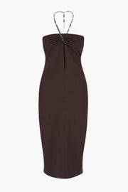 The Giona Midi Dress in Dark Brown by The Attico is a strapless dress with a chain halter neck design. This dress features a subtle cutout under the gathered bust area and its hem falls elegantly below the knees. Wear with a simple heel and statement clutch to your next evening event.