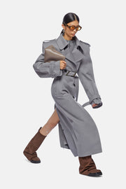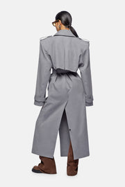The Grey Trench in Grey by The Attico is a classic belted trench coat with padded shoulders. Featuring a branded silver bely buckle, this is fully lined and double breasted. Pair yours with a black boot and a chunky knit for a chic Winter look.