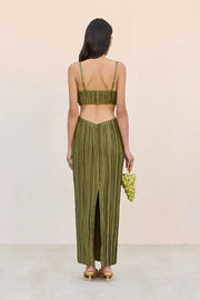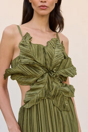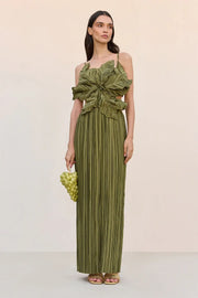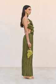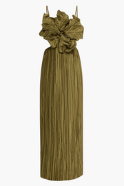 The Hestra Gown in Cedar by Cult Gaia is floor length gown in signature plissé with a center bust wired flower accent. Style with complimenting gold accessories and statement heels for your next event.