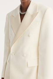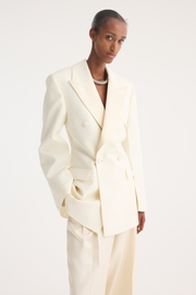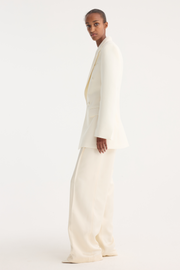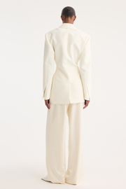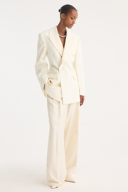 The Hourglass Blazer in Off White from RÓHE features a sharply cut notch lapel with contrast satin detailing and a contoured silhouette that dramatically cinches the waist and defines the shoulders. Crafted from pure virgin wool with special bonded construction, this piece merges precise structure with feminine elegance. Wear it over tonal suiting or tailored trousers to accentuate its bold, architectural lines.