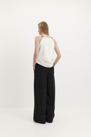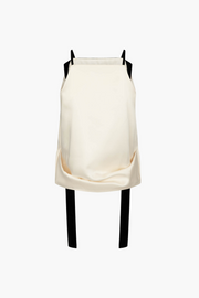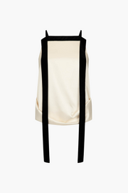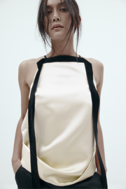 The Hubert Halter Top in Ivory from Harris Tapper is a refined evening top crafted in lustrous ivory satin. Designed with a minimalist square neckline, this sleeveless silhouette features long black velvet ribbon straps that drape softly from each shoulder, adding dramatic length and contrast. Pair with tailored pants or a column skirt for an effortlessly elegant ensemble.