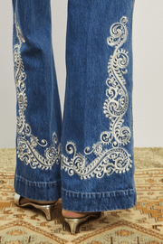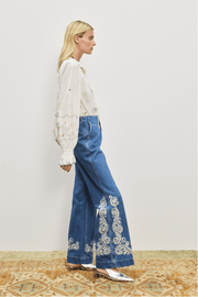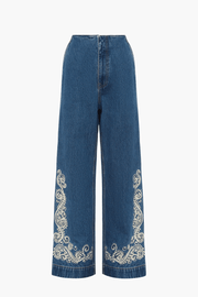 The Jacones Flare Denim Jean in Indigo from Alémais is designed with a timeless silhouette that combines everyday ease with subtle detailing. Featuring a front zip and button closure, side pockets, and an embroidered motif, they are crafted from 100% cotton for a structured yet comfortable fit.
