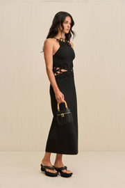 The Jena Dress in Black from Cult Gaia is a flattering midi dress crafted from a sponge knit yarn that gently hugs the body for a sculpted silhouette. Thoughtfully placed side cutouts and intricate corded crochet detailing add a dimensional, handcrafted feel. Ideal for day-to-night dressing with a sleek edge. Pair with minimal heels or sandals for a versatile, modern look.