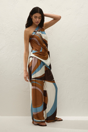 The Jensen Pant in Notte from Faithfull The Brand is crafted from a luxurious viscose satin blend, detailed in a distinctive 1970s-inspired geometric print. Designed to sit comfortably on the waist or hips, the elasticated waistband offers flexible wear, while the wide straight-leg silhouette creates effortless movement. Style with the matching top for a refined take on vacation dressing.