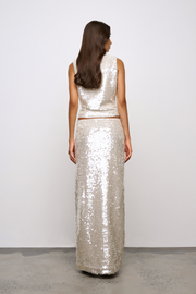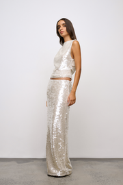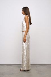 The Kane Top in Salt from One Of Others offers a relaxed silhouette with a boat neckline, rendered in a custom sequin fabrication for high-impact shine. Sleeveless and softly draped at the waist, this piece is perfect for layering with tailored separates or paired with the matching Kane Skirt for a statement ensemble.