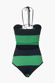 The Knitted Striped Bodysuit in Green/Blue from Coperni is a striped green and blue bodysuit with jewellery brooch detail. A perfect blend of beachy and sporty, this halterneck bodysuit combines the best of both worlds for a standout summer look. Slim spaghetti straps support a bikini-inspired top, which transitions into striking cut-outs, all secured by a statement silver-toned clasp in the shape of a graceful, sinuous 'C'. Style with your favourite denim and strappy heels for an fun evening look.
