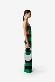 The Knitted Striped Halter Dress in Green/Blue from Coperni is a Striped green and blue maxi dress with jewellery brooch detail. A perfect blend of beachy and sporty, this halterneck dress combines the best of both worlds for a standout summer look. Slim spaghetti straps support a bikini-inspired top, which transitions into striking cut-outs, all secured by a statement silver-toned clasp in the shape of a graceful, sinuous 'C'. Style with silver accessories and strappy heels for an elegant evening look.