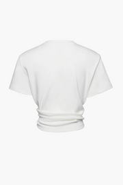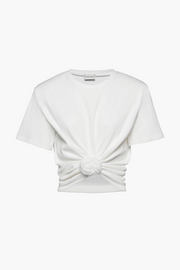The Knotted Ribbed T-Shirt in White by Magda Butrym elevates a classic ribbed silhouette with a front knotted detail and detachable shoulder pads for added structure. Crafted from a soft cotton-elastane blend with a cotton lining, it offers a flattering shape that pairs effortlessly with tailored or casual pieces.