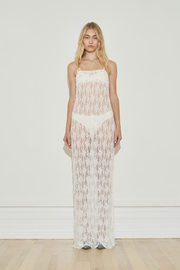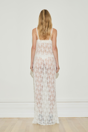 The Lace Maxi Dress in Cream from Maison Essentiele is a refreshed take on the brand's signature silhouette. Now crafted in delicate sheer seersucker lace for a light, textured finish. Designed to contour the body, it features a fluid longline shape, flat adjustable straps for comfort, and a softly scalloped hem for a romantic touch. Perfect for layering, this piece blends elegance with ease.