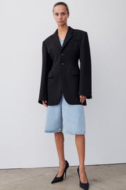 The Longline Blazer by WARDROBE.NYC in Black is a tailored essential with defined shoulders and elongated contour lines through the body. With a defined silhouette, this style contours the body & flatters the wearer's waist. Layer this style over a dress or pair back with the Denim Low Rise Jean or the Bonded Slim Trouser for versatile dressing.
