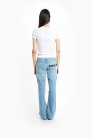 The Low Waist Denim Pants in blue light from Coperni are a modern take on everyday denim, blending structure with subtle detailing. Crafted in mid-weight non-stretch cotton, they feature a long inseam and a slim-straight cut that subtly flares at the hem. A Coperni logo belt detail at the back pocket elevates the classic 5-pocket design with a signature finish.