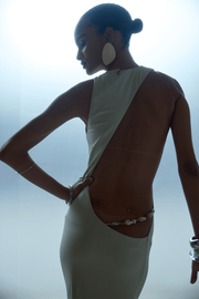 The Maha Maxi Dress in Optic Cream from De La Vali is a captivating evening silhouette that speaks to subtle seduction. Crafted from fluid viscose jersey, it clings and drapes with elegant restraint, featuring a clean round neckline and sculptural side cut-outs that accentuate the waist. A beaded strap detail at the hip adds a delicate focal point, while the dramatic scooped back introduces bold contrast to the fluid, floor-length line. Designed to move with ease and allure, Maha is made for moments that unfold beyond the ordinary.