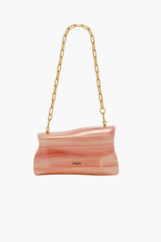 The Malaya Clutch in Rose Water by Cult Gaia is an abstract, marbled acrylic bag with a flat bottom and removable chain strap. Featuring gold-toned hardware, this versatile clutch combines modern artistry with functional design. Wear it with a sleek cocktail dress and heels for a refined evening ensemble.