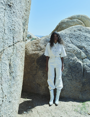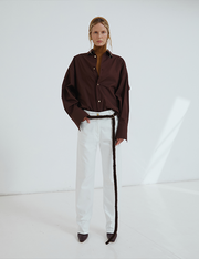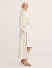 The Malika Short Coat in Ecru from Isabel Marant Étoile is a utilitarian-inspired piece designed with timeless tailoring and functional detailing. Cut in a straight silhouette, it features a round collar with button tab, hidden button fastening, chest patch pockets, and flap pockets at the hips. A removable belt with metal buckle allows for versatile styling, cinching the waist or wearing loose for a relaxed look. Finished with a rear flap and topstitching throughout, it brings a refined approach to workwear classics.