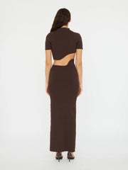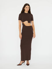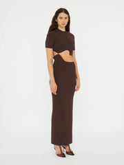 The Maparadita Lattice Seperation Dress in Espresso from Christopher Esber is crafted in rib jersey and contoured to the body through a single fluid cut-out at the waist. Finished with a high crew neckline and short sleeves for a clean, grounded silhouette. Pair with heels for evening or flats for understated daywear.